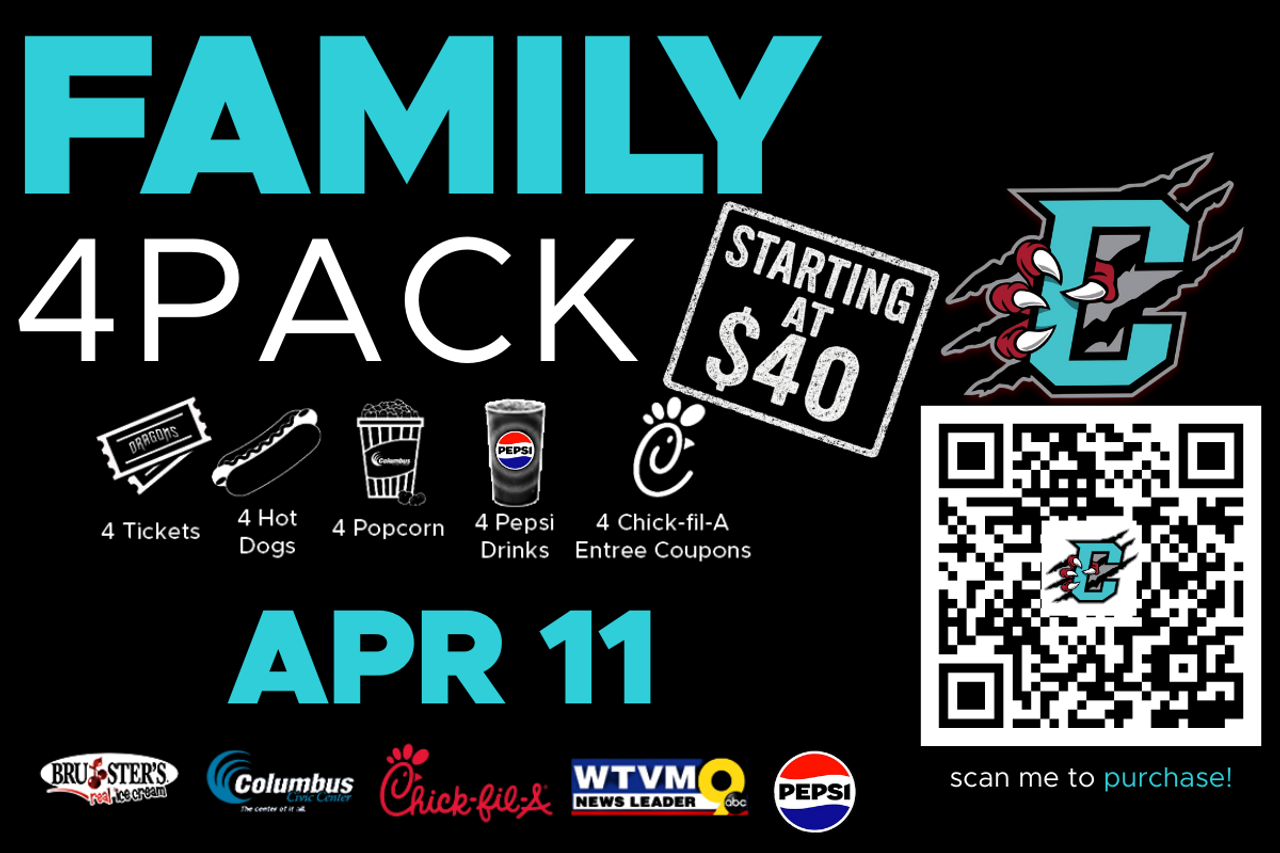 The Family 4 Pack Presented by Chick-fil-A Midland, Buffalo Rock Pepsi, Bruster's, WTVM, and the Columbus Civic Center.