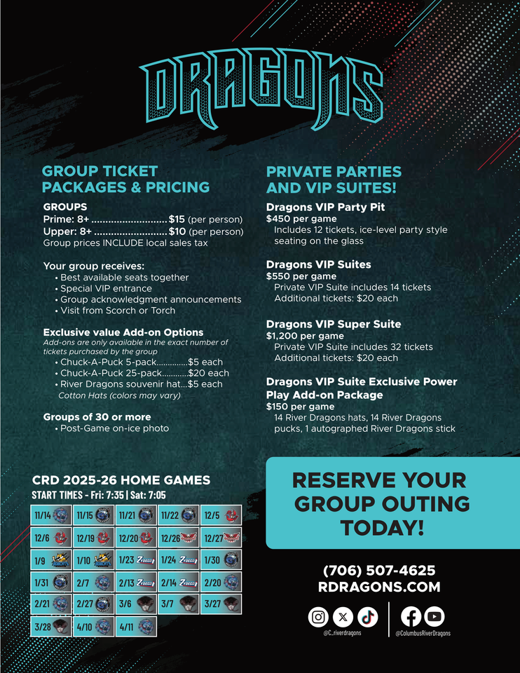 Call our ticket representatives at 706-507-4625 or email hockeytown@rdragons.com for more information. Ask aboutbirthday parties!