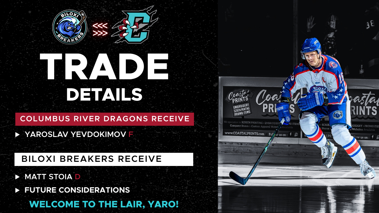 COLUMBUS, GA. — The Columbus River Dragons announced today that the club has acquired forward Yaroslav Yevdokimov from the Biloxi Breakers, in exchange for defenseman Matt Stoia and future considerations.